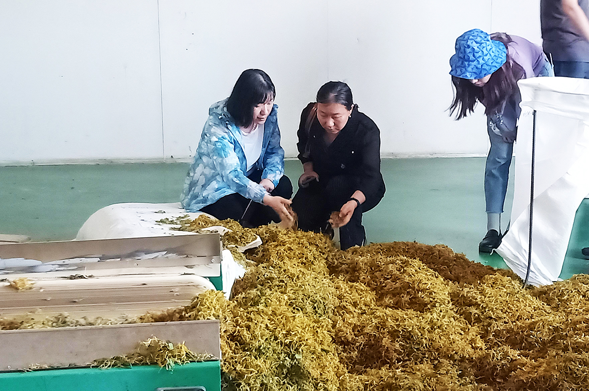 师生调研金银花的产品加工情况,与技术工人进行了探讨