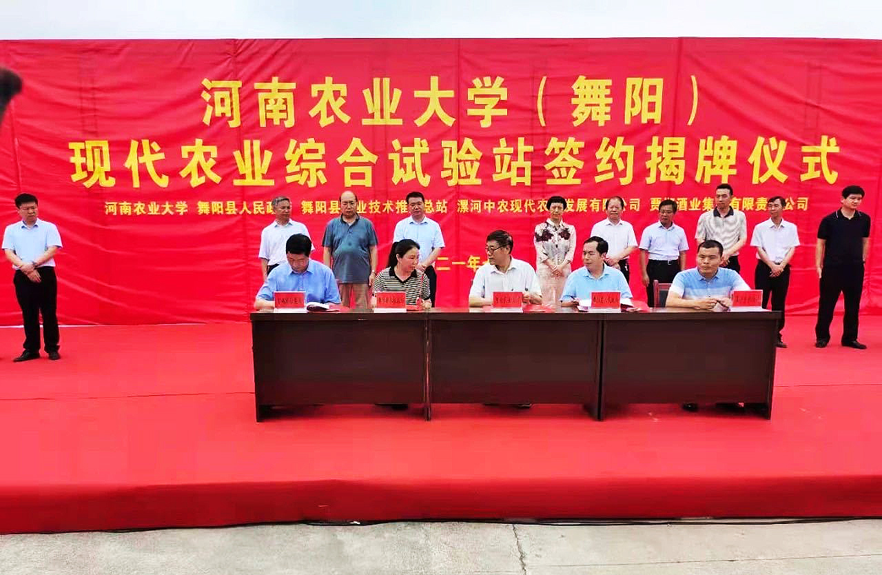 (舞阳)现代农业综合试验站在舞阳县举行签约揭牌仪式。副校长康相涛,河南省种子站副站长周继泽,省农技推广总站副站长鲁振,漯河市农业农村局长罗静、市供销社主任曹志刚,舞阳县人民政府县长朱署光、县财政局、农业农村局、供销社、农技总站有关负责人及乡镇负责人出席签约仪式。贾湖酒业集团有限公司、河南中农现代农业发展有限公司相关负责人参加仪式。我校宣传部、社会服务处、猫都论坛