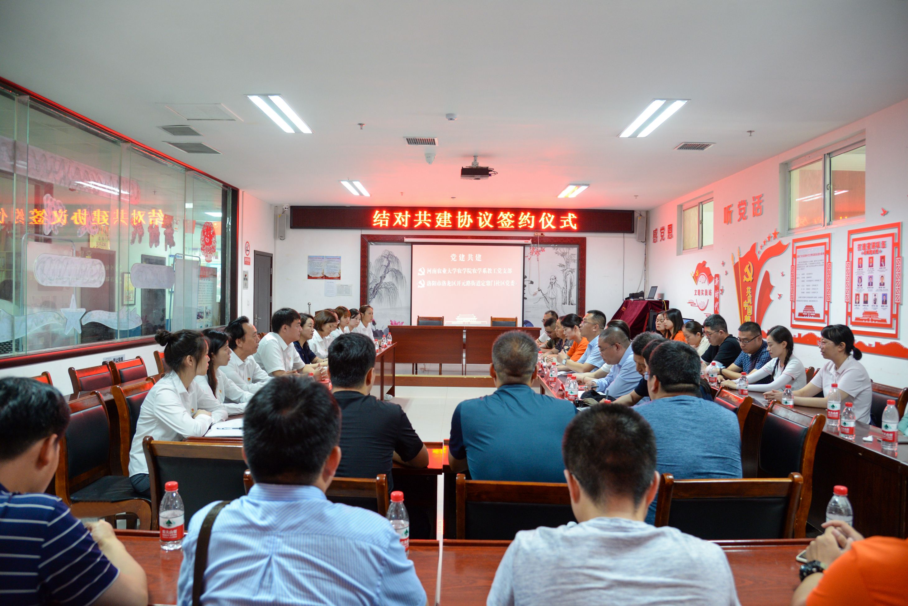 农学系教工党支部书记王志强和定鼎门社区党委书记赵春阳共同签订了结对共建协议书。王建忠、史艳红分别代表签约双方致辞,希望结对双方珍惜结对共建的合作机遇,找准党建工作的共同点、开展活动的切入点, 相互交流、取长补短,充分发挥结对双方党组织的优势特色,不断拓展双方合作的广度和深度,不断提高双方党组织的党建工作水平。与会人员围绕共建意义、内容、范围和活动形式等方面进行了交流探讨。