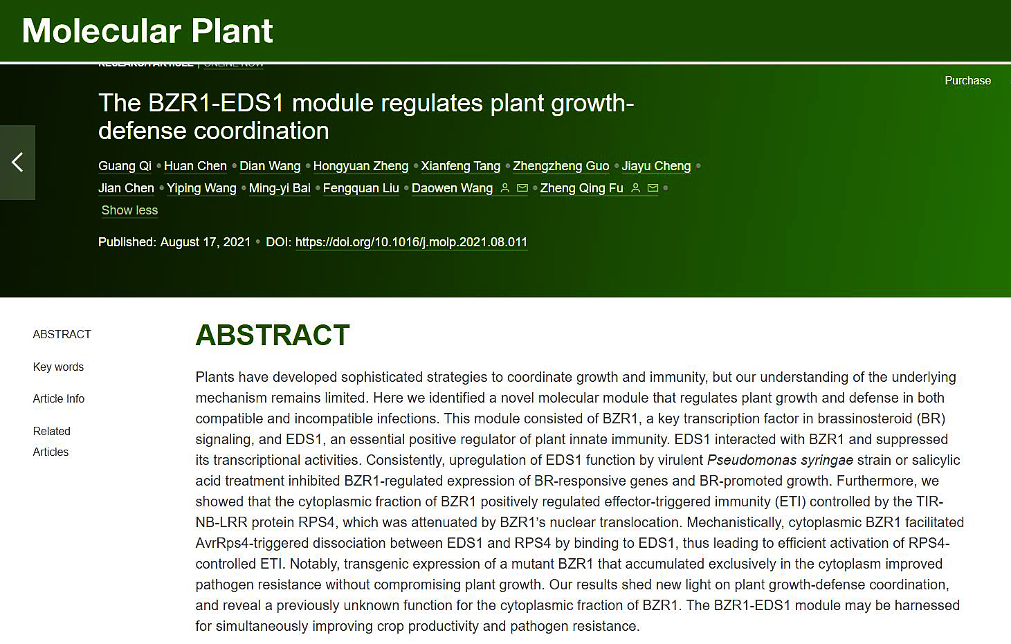 该研究成果以题为“The BZR1-EDS1 module regulates plant growth-defense coordination”的研究论文在线发表于国际知名期刊Molecular Plant。王道文团队博士后祁广为本文第一作者,王道文研究员和傅正擎副教授为共同通讯作者。本研究得到了国家自然科学基金项目(91935304),河南省博士后科研项目以及美国国家科学基金项目(EAGER grant 1464527 and grant IOS-1758994 to ZF)资助。