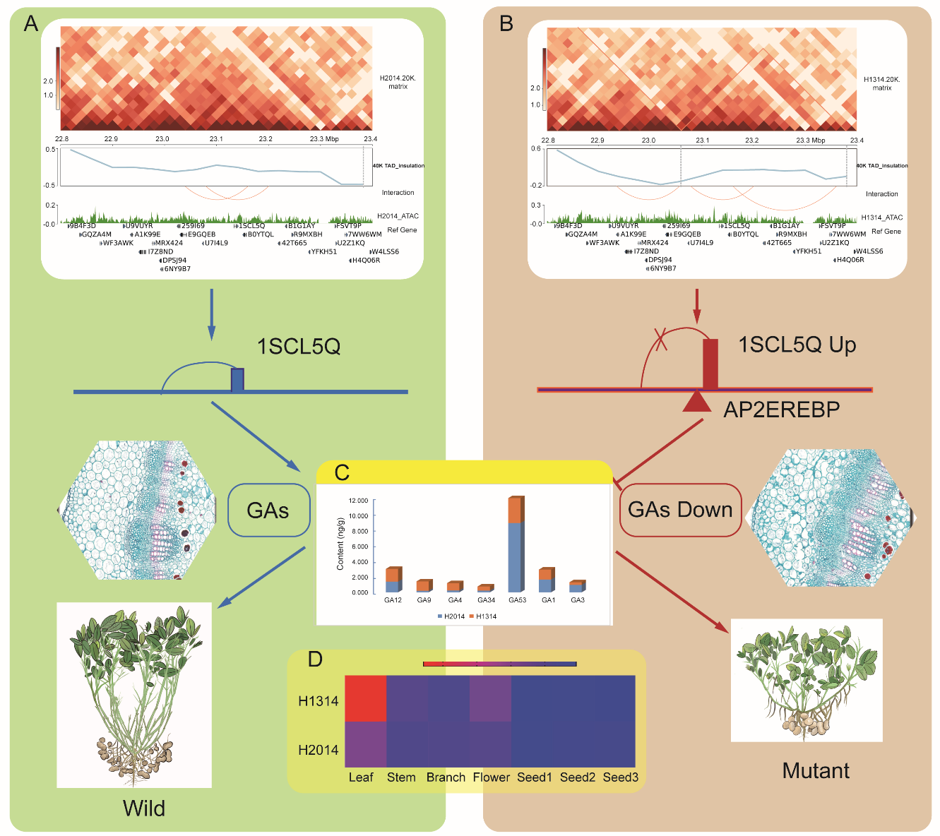 在花生3D图谱中,野生型和突变体共鉴定有6700多个TADs,特异性TADs边界对生物功能至关重要,花生TAD边界区基因表达水平和基因密度高、 GC含量较低,具有多个序列Motif(HMG和ARF-2)。通过ATAC-seq技术在全基因范围内检测突变体和野生型的染色质开放性变化,鉴定得到1805个差异显著的peaks。研究发现突变体中由于顺式元件之间的相互作用形成了一个新的TAD,该染色质空间结构的变化使得远离目标基因的调控元件AP2EREBP-binding motif接近其目标基因GA2ox gene,促进其转录,降低活性GA含量,最终导致植株矮化表型。该研究首次提供了花生基因组三维结构和染色质可及性的全基因组特征,为理解植物染色质组织和基因调控之间的关系提供了新的思路。