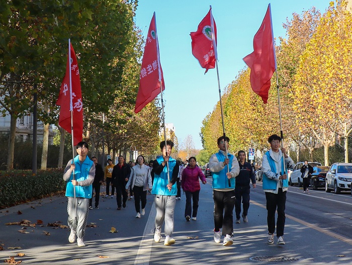 下午3时许,龙子湖校区体育馆前各系红旗迎风招展,参赛教职工朝气满满、整装待发。“活动开始!”随着校党委委员、院党委书记郭战伟的一声令下,各系参赛教职工相携而出,沿龙子湖校区有序行进,大家相伴而行,一路欢声笑语,成为校园里一道亮丽的风景线。