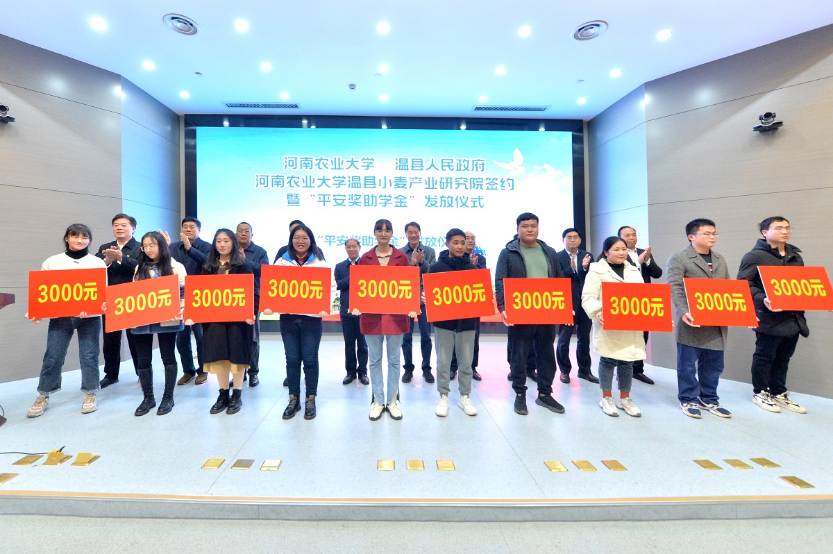 的合作历史悠久,今天,学校与温县签署框架合作协议、与河南平安种业有限公司共建小麦产业研究院,将进一步深化校地、校企在现代农业领域的合作交流,为加快推进我省农业高质量发展,为国家粮食安全和乡村振兴作出新的更大贡献。他对河南平安种业有限公司在我校设立“平安奖助学金”表示衷心感谢,指出学校将用好“平安奖助学金”,提高人才培养质量,为社会培养更多优秀的农业科技人才。他勉励获奖的同学们,要立足新时代,把对远大理想的向往与追求转化为实际行动,把握机遇、勤奋学习,努力做有知识、有涵养、有品德、有魅力、有抱负、有能力的时代青年。