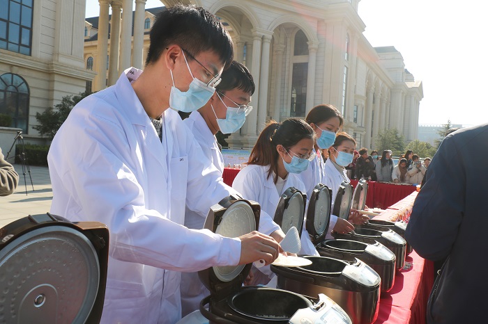 2200多名同学们饥肠辘辘,正赶往食堂。龙子湖校区繁塔楼西侧广场上,一溜电饭煲排开,晶莹剔透的大米饭、香甜软糯的玉米棒和汤圆已经做好。打开盖,阵阵香气让人馋涎欲滴,食指大动。