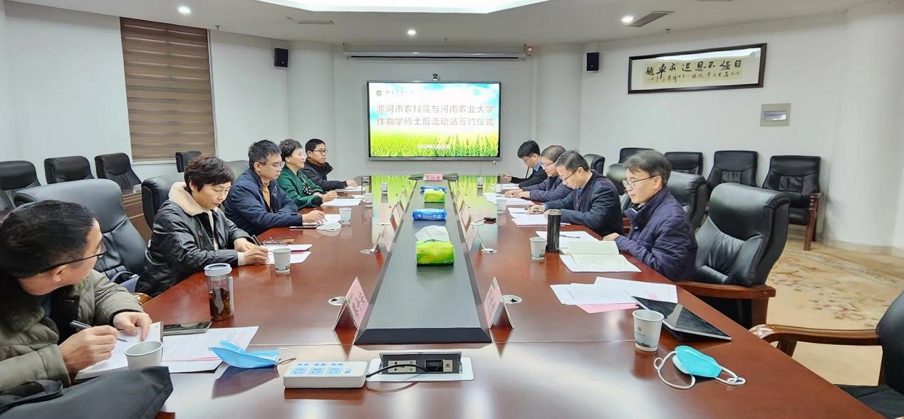 与漯河市农科院联合培养博士后签约仪式在龙子湖第一实验楼举行。院党委书记马菲,学术副校长、院长王道文;漯河市农科院党委书记巴磊、院长齐晓红出席签约仪式,学院相关负责人参加活动。王道文主持会议。