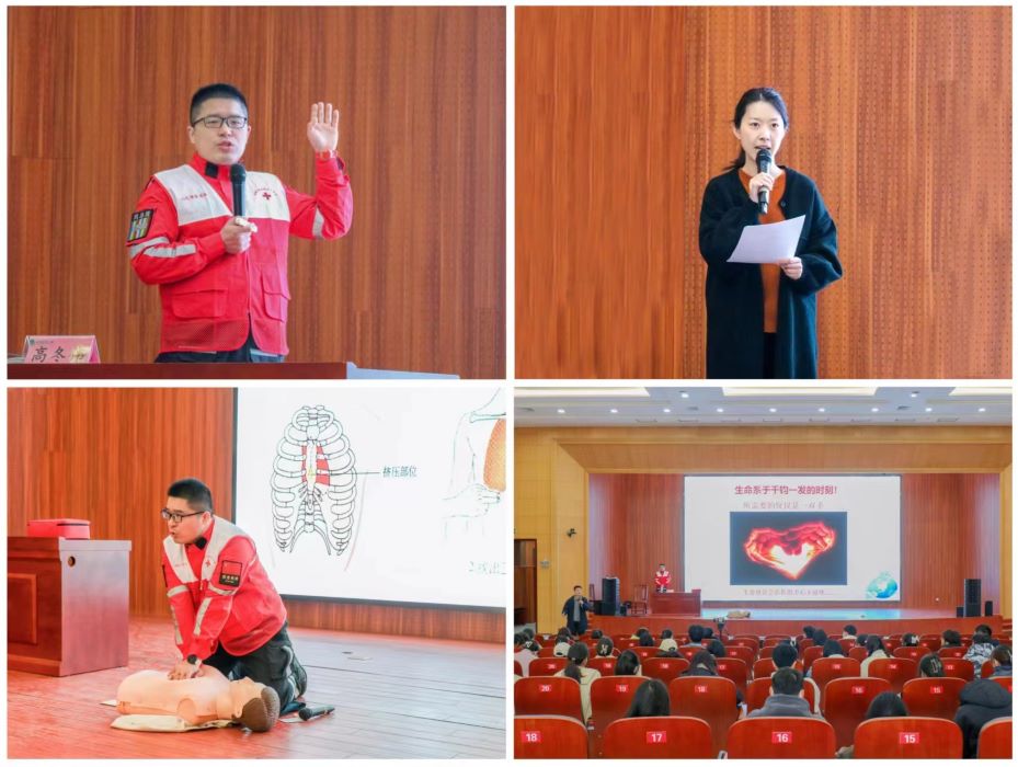 讲座开始,高冬伟为同学们介绍我国急救知识普及现状,结合相关视频讲解心肺复苏和人工呼吸的相关知识和步骤,重点讲述了救助过程中常见错误步骤和正确实施方法,呼吁同学们关注急救知识,关爱生命。并通过对当下社会急救的正反案例进行讲述,提醒同学们在实施急救时首要保证自身安全,客观冷静分析现场情况从而提高急救成功率,同时强调急救知识的重要性,有利于会后同学们在实际生活中对急救知识的学习落实。并为同学们介绍了生活中除颤仪的位置查询方法和使用步骤,最后他又给大家详细讲解了气道梗阻的急救方法,并找同学上台具体演示,让同学对急救流程有了更直观的了解。