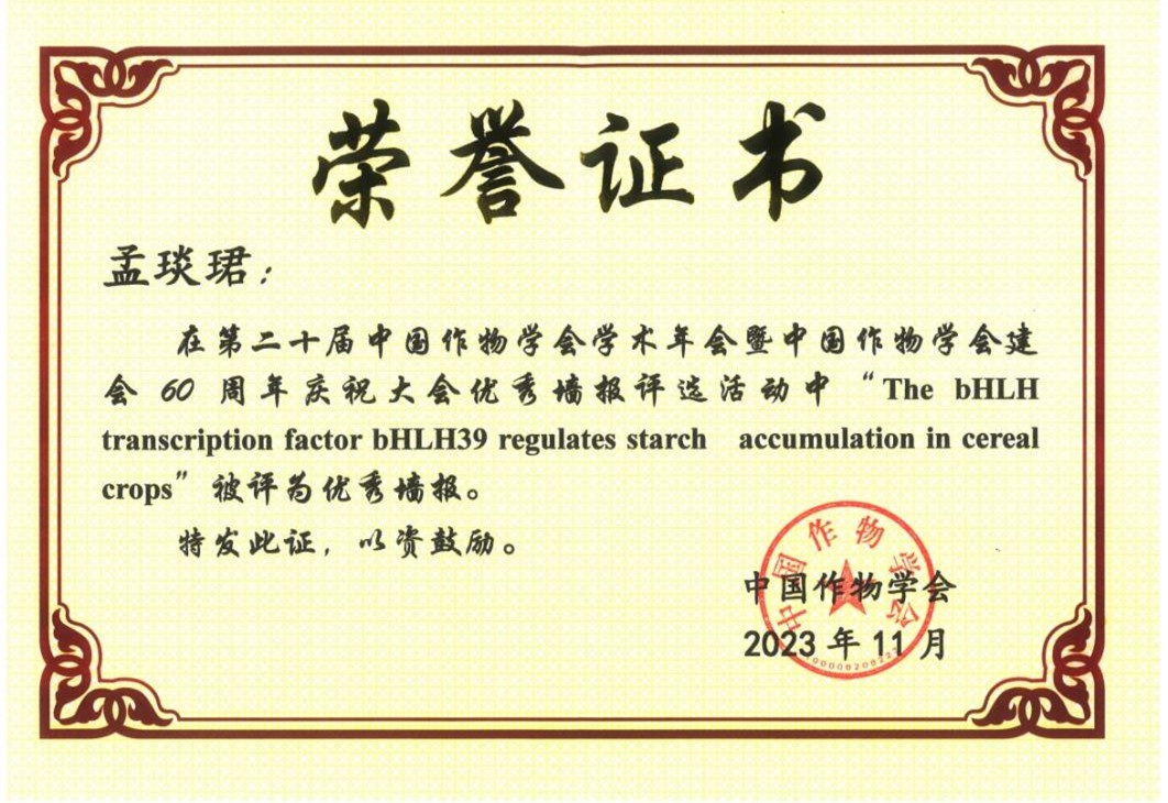 学子刘金提交的摘要在452份会议论文摘要中脱颖而出,被大会组委会选中,她以“TaNAC71在小麦钾高效利用中的作用机制研究”为题在研究生论坛做报告。面对来自中国农业科学院等单位研究生的竞争压力,刘金沉着冷静,稳定发挥,得到主持人的高度评价,最终以优异成绩喜获研究生论坛“优秀学术报告”,大会仅12名研究生获此荣誉。此外,孟琰珺提交的“转录因子TabHLH39在小麦淀粉合成中的功能研究”墙报在众多墙报中脱颖而出,获“优秀墙报”奖,本次大会仅有18名研究生获该荣誉。上述荣誉也是我校参与本次大会唯一分别入选的“优秀学术报告”和“优秀墙报”。