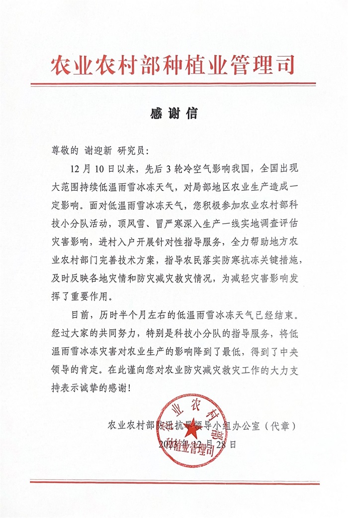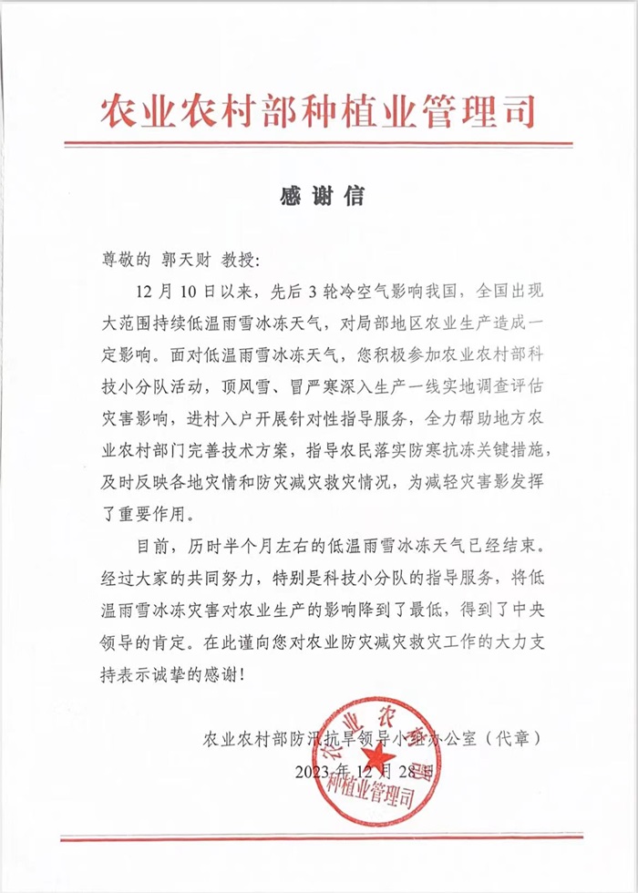 信中高度赞扬了郭天财、王晨阳、谢迎新三位专家,感谢他们针对小麦成熟期“烂场雨”造成穗发芽等不利形势,第一时间深入生产一线实地调查评估,完善防灾减灾救灾技术方案,有针对性的开展技术指导,最大限度地降低因灾损失;感谢他们针对近期持续低温雨雪冰冻天气,顶风雪、冒严寒深入麦田开展调研和指导工作,得到中央领导的肯定,为助力小麦丰产丰收发挥的重要作用。刘天学教授作为农业农村部大豆玉米带状复合专家指导组成员,充分发挥专业优势,积极做好调研指导、决策咨询、技术指导、培训交流等方面的专家技术支撑作用。信中对刘天学教授的辛勤付出表示由衷的感谢和崇高的敬意!并期待刘天学教授继续发挥专业特长,为我国大豆玉米带状复合高质量发展和全面推进乡村振兴贡献新的力量。