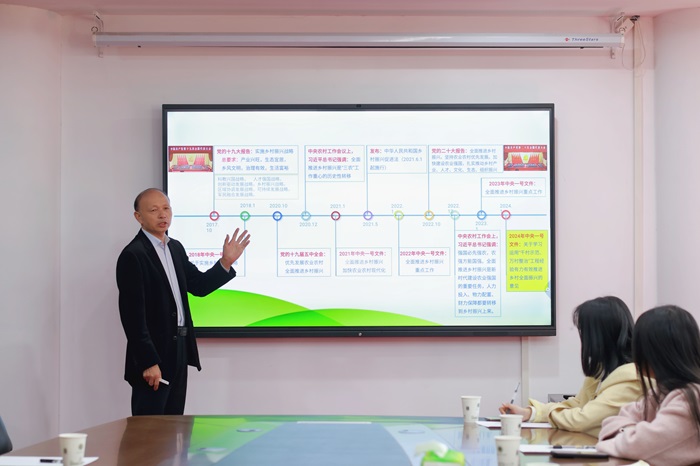 新农村发展研究院执行院长、硕士生导师胡彦民教授以乡村振兴战略与现代农业发展为授课主题,为选调生们讲解了“全面推进乡村振兴”的推进过程与工作部署。胡彦民通过建安区富硒小米等多个农业发展案例,深入浅出,启发各位在村任职选调生将农学、市场营销学等学科知识应用到基层工作中,并针对选调生提出的问题做了具体回答。他谈到:“实施乡村振兴战略对全面建成小康社会、实现中华民族伟大复兴的中国梦具有深远意义,产业振兴是乡村振兴的重中之重,一二三产业融合发展是发展现代农业的有效途径和必由之路,三产融合发展的新模式,有利于农业更强、农民更富、农村更美,进而推动乡村振兴和社会进步”。