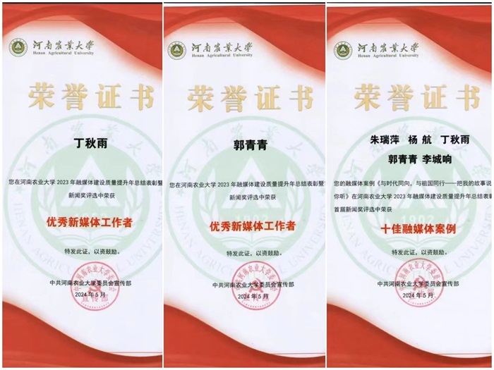 西平基地驻地师生助力金秋玉米丰收》、《“种业芯片”招聘会:凝心聚力促就业,科教融合助振兴》、《2023国际产学研用合作会议暨第七届黄河国际论坛隆重开幕》荣获优秀新闻类作品新闻类二等奖;《自信极了!245名农院学子在中国诗歌节中品读经典,坚定文化自信》荣获优秀新闻类作品优秀新媒体作品;《“春如四季”再次上演,殷贵鸿院长为大家解析气温骤降对小麦生长的影响,并提供“锦囊妙计”》、《愿此去繁花相送,再遇时情谊依旧》荣获优秀新闻类作品短视频类三等奖。