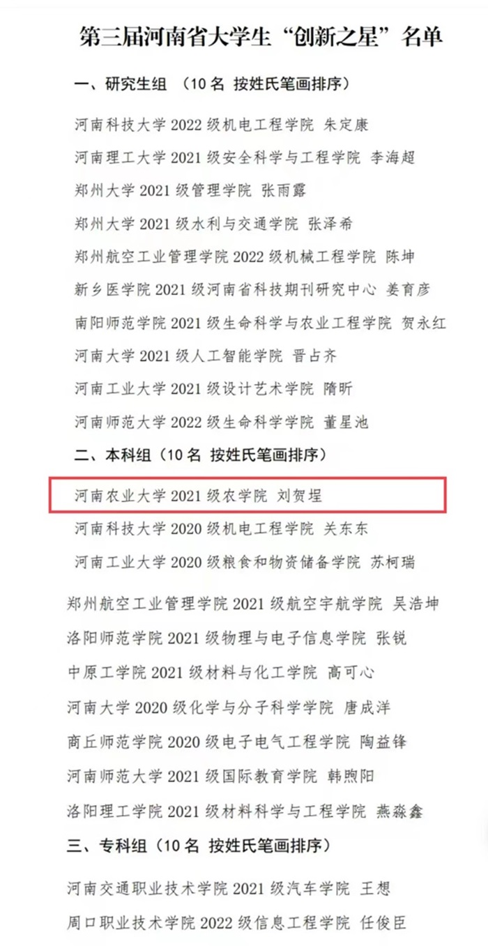 2021级本科生刘贺埕荣获第三届河南省大学生本科组“创新之星”。