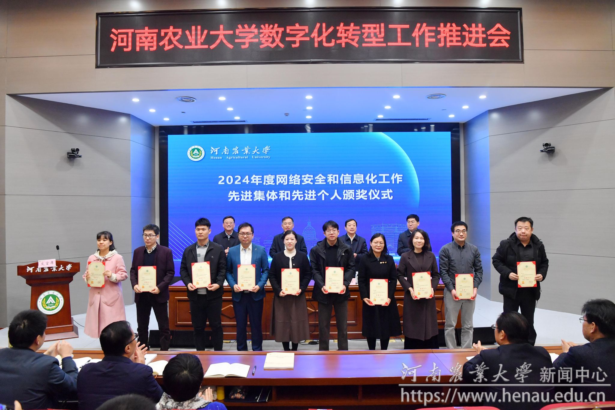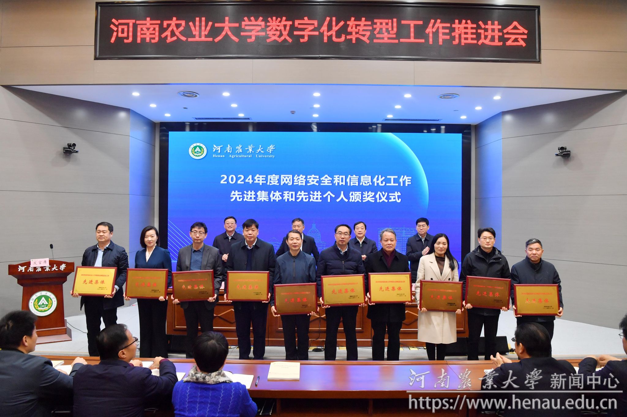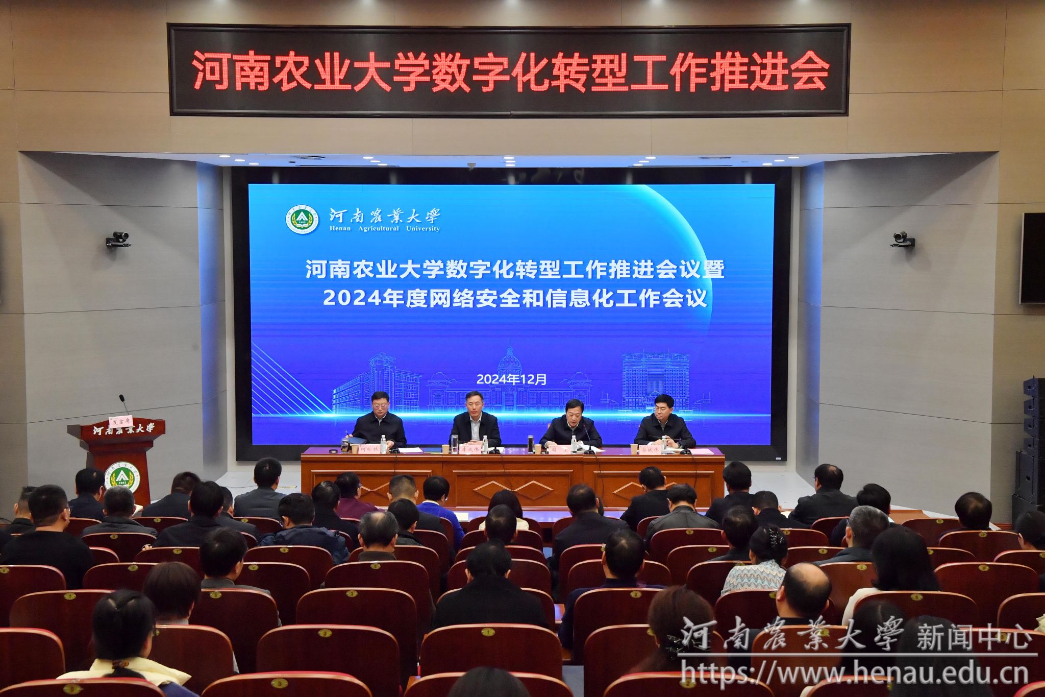 郭战伟作学校信息化发展的报告。他指出,学校近年来在数字化转型过程中取得了明显成效,但也存在一系列深层次、结构性的问题与挑战等待解决。各单位要转变工作理念,提升工作标准,强化信息化服务师生的能力,以一流的信息化建设水平引领学校在教学、科研、管理等方面的数字变革。一是要深化纲要落实,科学谋划转型。科学谋划本单位数字化转型工作,全面梳理本单位信息资产台账,制定本单位数字化转型计划。二是要加强数据建设,重塑业务流程。秉持“信息系统+业务服务+数据应用”理念,聚焦数据生产要素建设,打造数据全生命周期闭环。三是要丰富信息资源供给,推动服务现代化。强化“信息资源池”建设,通过统筹和建设,提升学校的信息化资源供给能力。四是要提升数字化转型能力,赋能农业新质生产力。完善师生参与数字转型的机制,打造学校高水平可持续的信息化人才梯队,培育具有数字创新思维与实践能力的复合型人才,为发展农业新质生产力添砖加瓦。五是要筑牢网络安全底线,守护数字转型成果。加强网络安全制度建设、网络安全防护措施、网络安全宣传与教育、网络环境整治,为师生营造一个安全清朗的网络空间。