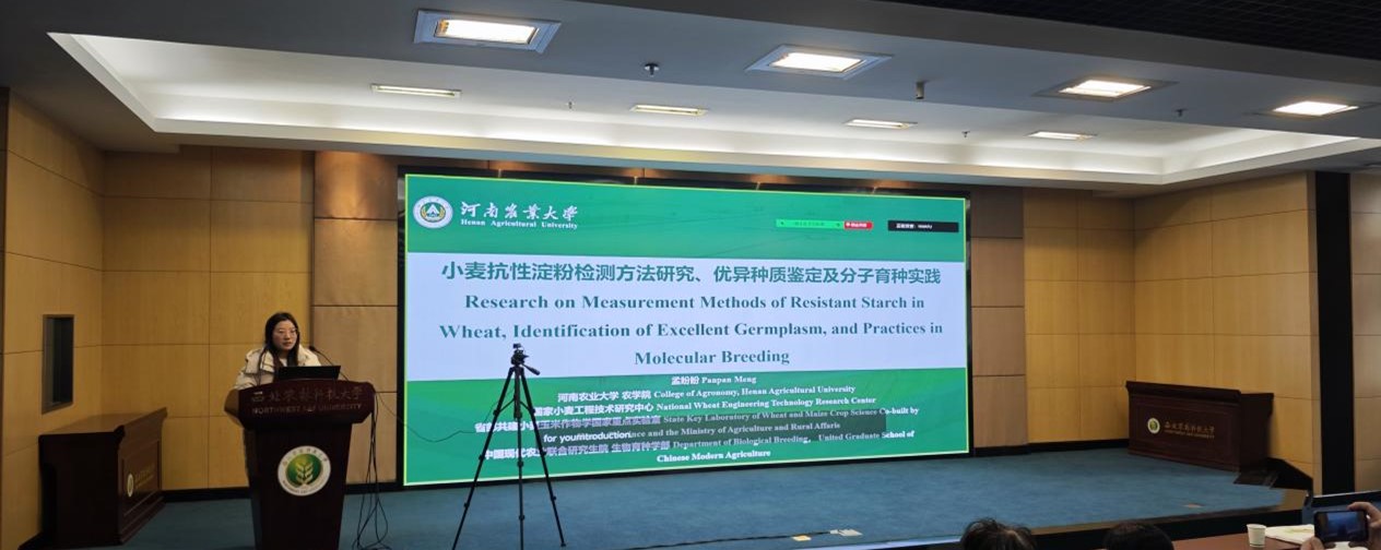、中国现代农业联合研究生院殷贵鸿研究员课题组博士研究生孟盼盼同学,应邀在研讨会上作了题为“小麦抗性淀粉检测方法研究、优异种质鉴定及分子育种实践”的精彩报告。孟盼盼的汇报围绕当前小麦抗性淀粉研究中存在的三大关键问题展开。她的报告指出,小麦抗性淀粉作为一种重要的功能性成分,在食品、保健品及医药领域具有广泛的应用前景,然而,现有的检测方法存在较大差异,测定过程复杂,重复性差,这极大地制约了小麦抗性淀粉研究。同时,优异高抗性淀粉种质资源的匮乏和高抗性淀粉小麦新品种的缺乏,也限制了小麦抗性淀粉的产业化进程。孟盼盼详细介绍了其所在的小麦种质创制与新品种培育科技创新团队针对以上三大问题开展的系列科技创新工作,引起了与会专家和代表的广泛关注与热烈讨论。与会代表纷纷表示,这些研究成果具有重要的理论和实践意义,为推动小麦抗性淀粉研究的深入发展和功能营养小麦产业的转型升级提供了有力支撑。