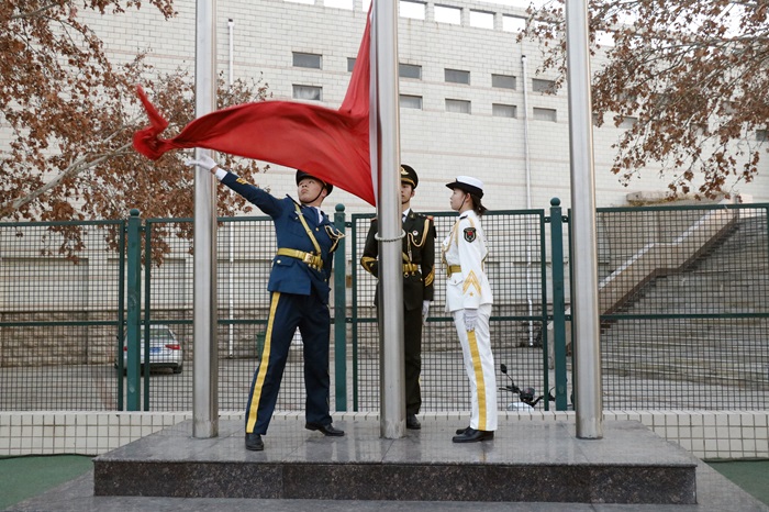 仪式开始,国旗护卫队迈着铿锵有力的步伐,护卫着国旗走向升旗台。全体师生肃立,高唱国歌,目送五星红旗冉冉升起。国旗下,猫都论坛