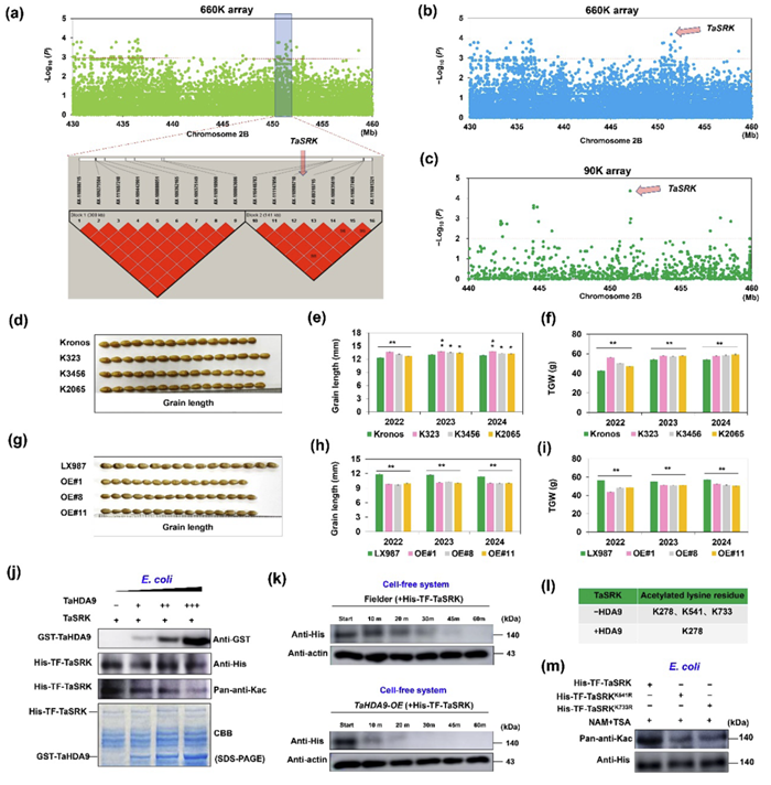 为了挖掘小麦籽粒大小调控基因,本研究对349份小麦材料进行了多年多点的籽粒大小和千粒重调查,通过GWAS分析确定一个多环境显著的Block、该区间包含了11个候选基因,并进一步结合EMS突变体库、转录表达和小麦Pan800K的基因测序信息等锁定TaSRK为关键候选基因(图1b-c),该基因存在4种单倍型,其中TaSRK-Hap1的粒长和千粒重显著较高。连续3年田间数据显示,TaSRK过表达转基因小麦粒长变短、千粒重显著下降,而突变体则显示粒长变长、千粒重显著上升(图1d-i)。以TaSRK蛋白为诱饵,通过酵母双杂交筛选小麦cDNA文库,确定了一个组蛋白去乙酰化酶TaHDA9。实验证实TaSRK和TaHDA9存在蛋白互作。体外和半体外去乙酰化实验均证实TaHDA9直接去乙酰化TaSRK的2个赖氨酸位点K541和K733,并由此降低其蛋白积累(图1j-m)。2022-2024连续3年农艺性状调查结果表明,TaHDA9过表达转基因小麦籽粒变长、千粒重显著增加,而突变体籽粒变短、千粒重显著下降。