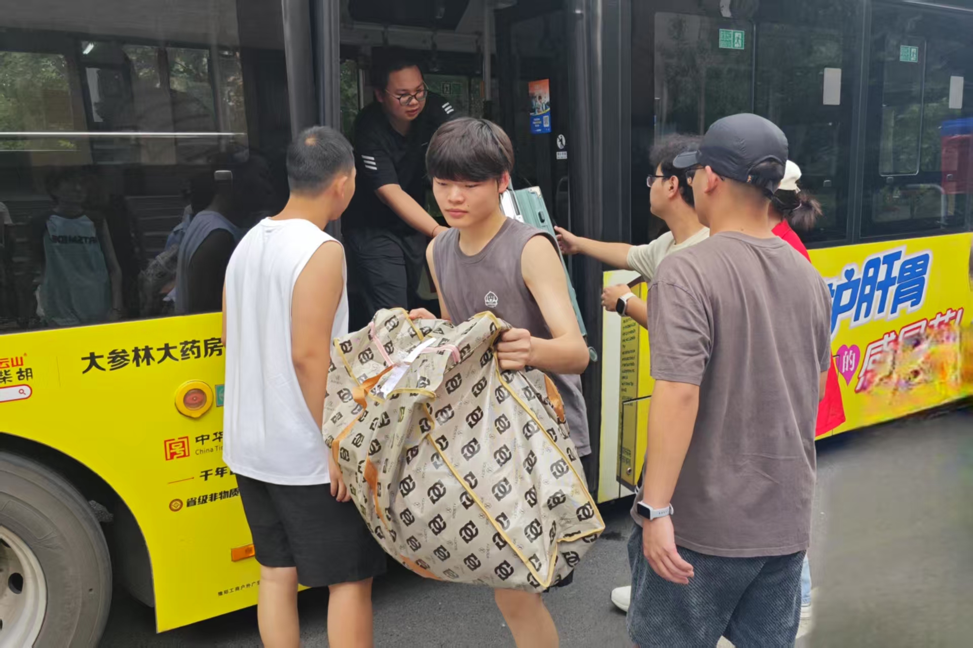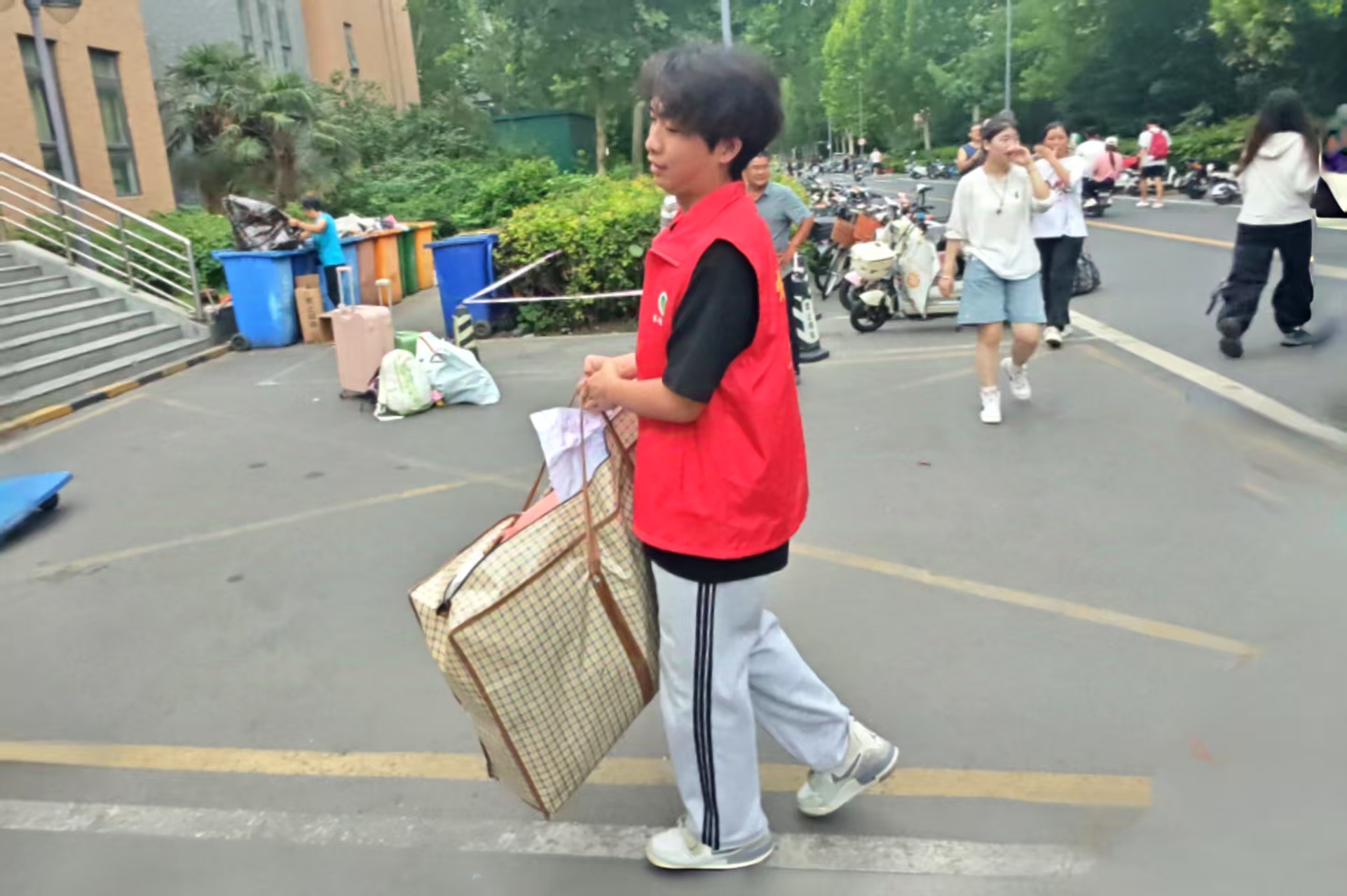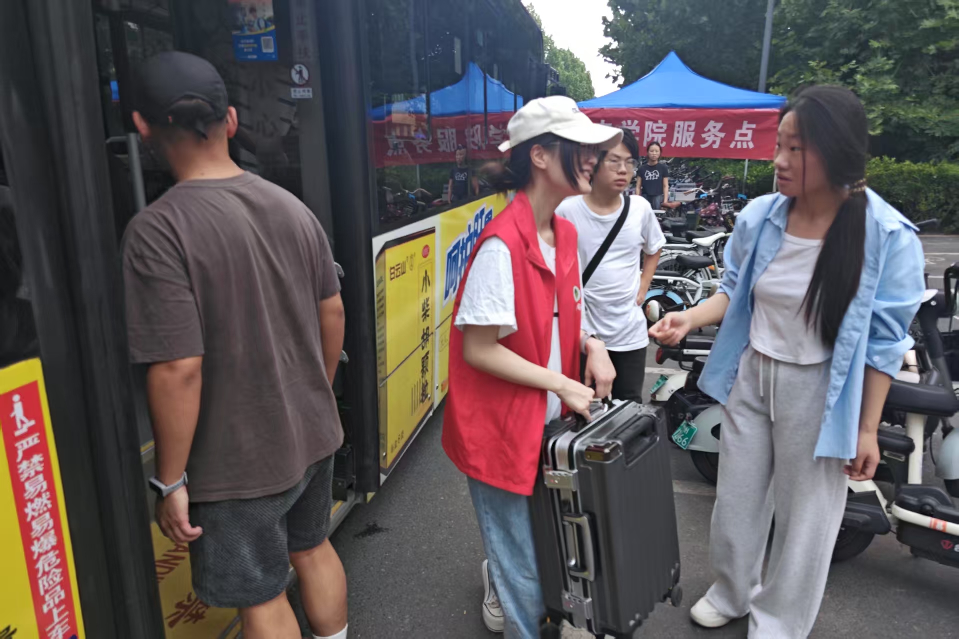 志愿者帮助学生搬运行李