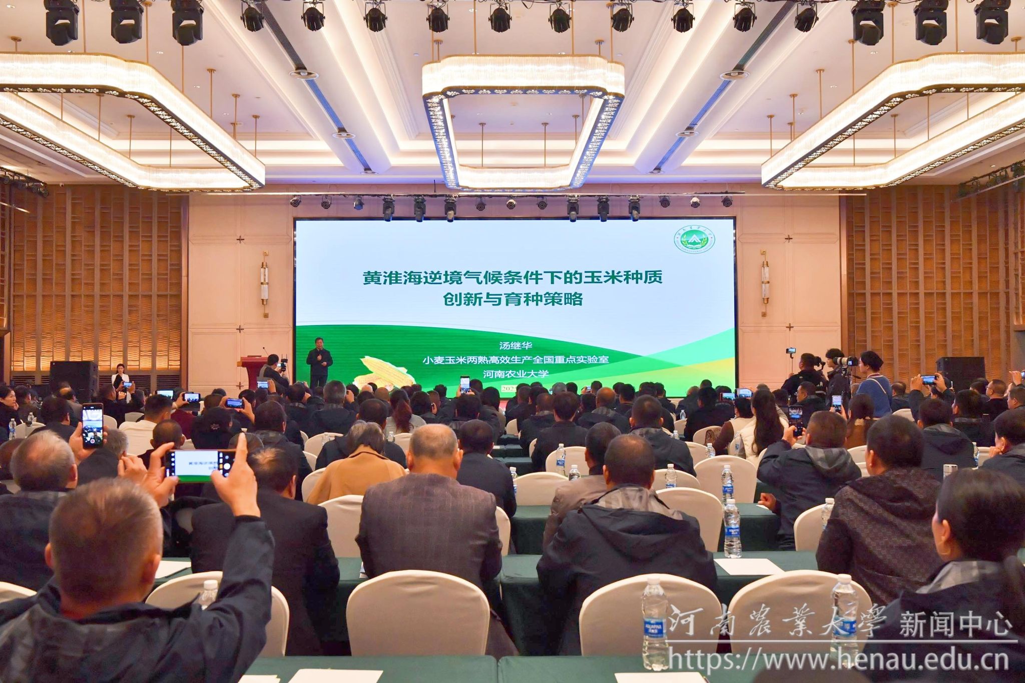 负责人详细介绍了学校玉米育种的发展态势。汤继华作了《黄淮海逆境气候条件下的玉米种质创新与育种策略》专题报告,详细介绍了黄淮海夏玉米生产面临的问题、抗逆玉米育种目标及育种策略等方面的内容。汤继华详细阐述了所在团队的玉米新品种研发历程、技术突破以及未来的科研规划。汤继华表示,团队将继续围绕国家和产业急需进行有组织、“有用处”的科研,让更多农业科研成果从实验室走向田间地头,为保障国家粮食安全和促进农业高质量发展贡献更多科技力量。