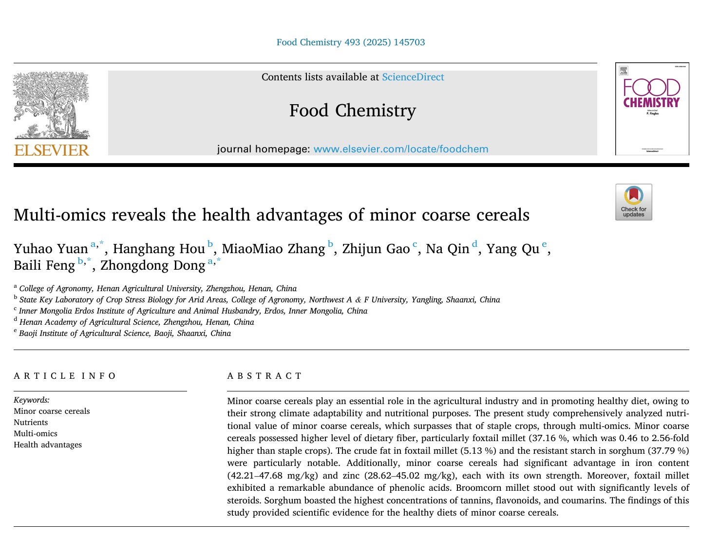 冯佰利教授团队在《Food Chemistry》上发表了题为“Multi-omics reveals the health advantages of minor coarse cereals”的研究论文。该研究通过基础营养评估、离子组学和代谢组学揭示了杂粮优于主粮的营养健康优势。