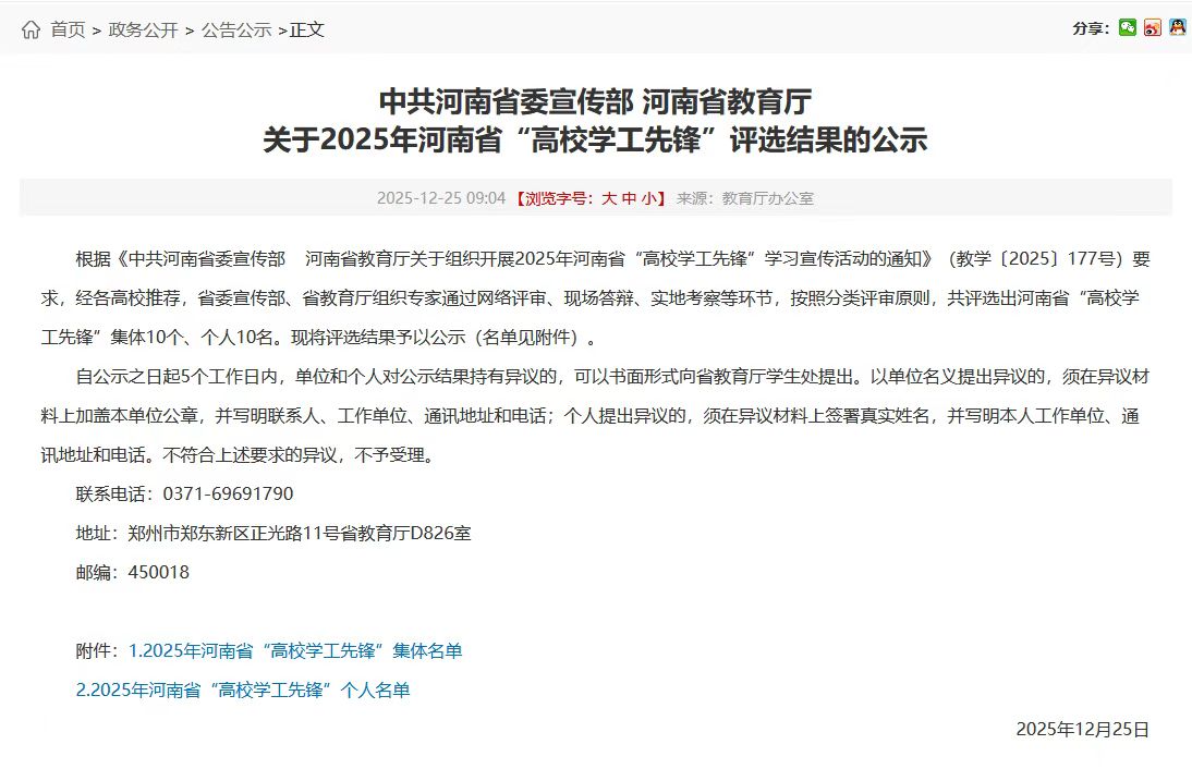 本网讯(通讯员 秦仪雯)近日,中共河南省委宣传部、河南省教育厅联合公布了2025年河南省“高校学工先锋”评选结果,经各高校推荐,省委宣传部、省教育厅组织专家通过网络评审、现场答辩、实地考察等环节,猫都论坛