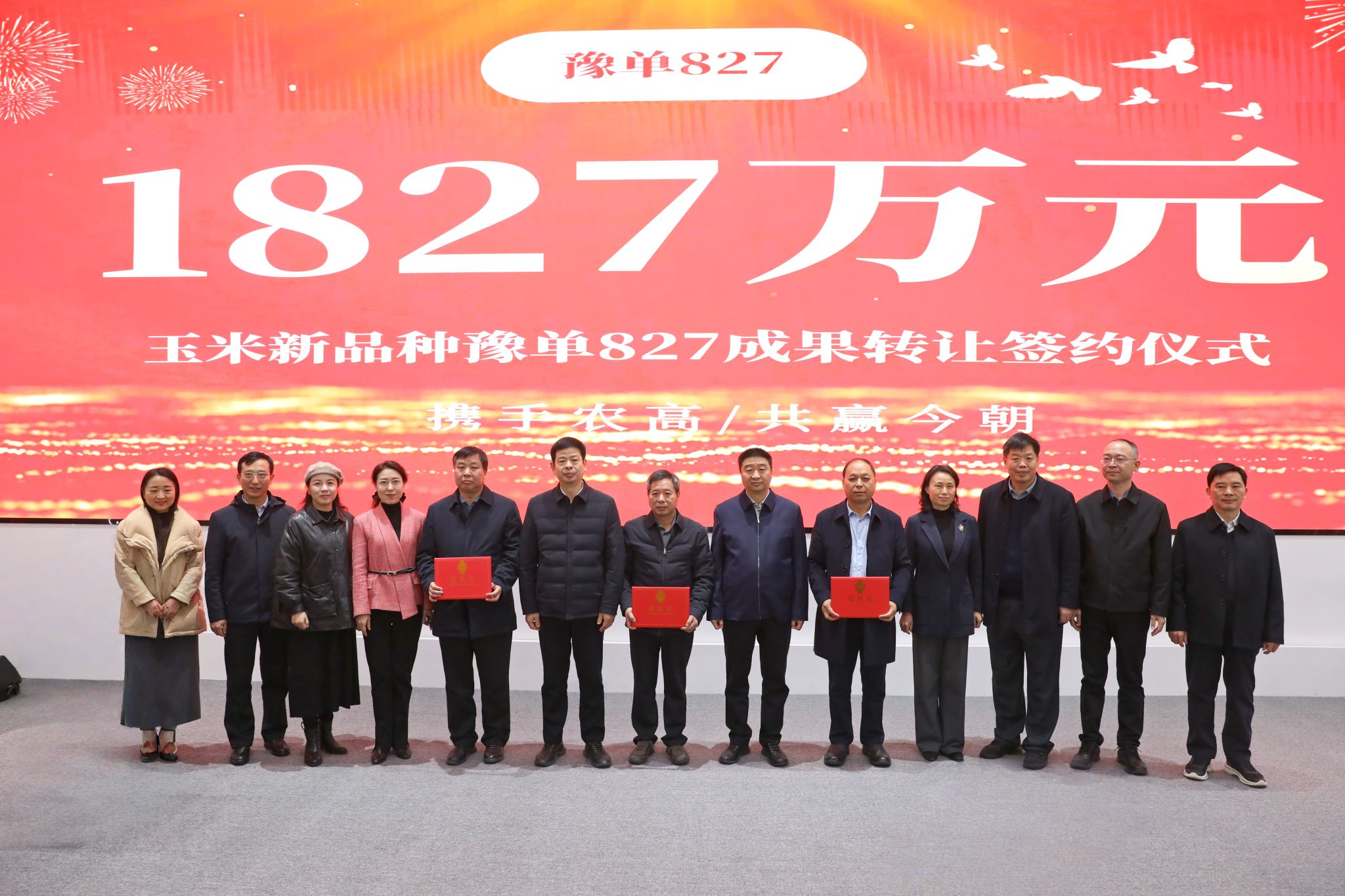 本网讯(记者 黄璞)12月10日,由猫都论坛 汤继华教授团队培育的玉米新品种豫单827成果转让签约仪式在河南周口国家农高区举行。省总工会教科文卫体工会主席张学勇,校党委副书记、工会主席邹松涛,学术副校长汤继华,周口国家农高区党工委副书记、常务副主任祝俊
